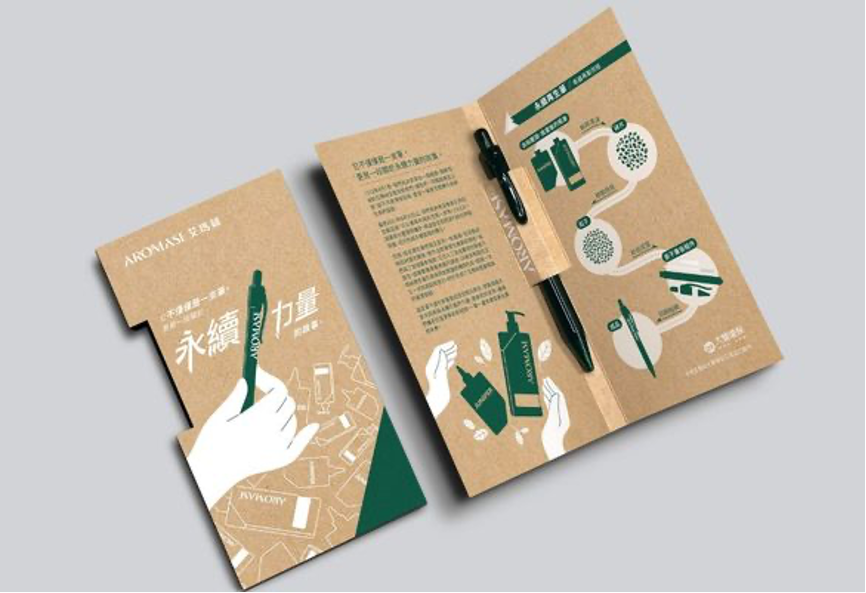 2023 年,艾瑪絲從品牌官網與實體合作通路募集洗髮精空瓶,共蒐集 128 公斤塑料,製作成再生筆回饋給艾粉。過程並不容易,再生塑料在製作上容易因材質特性影響強度與耐用性。